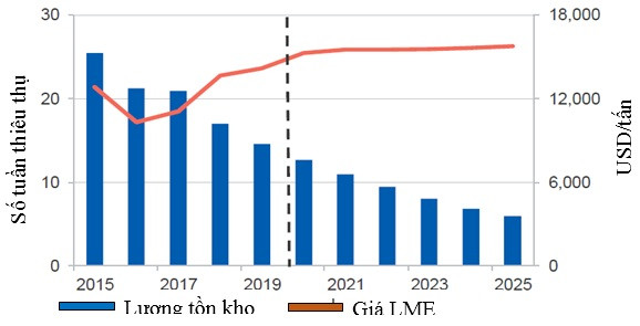 Hình 1. Lượng tồn kho và giá niken giai đoạn 2015 - 2025